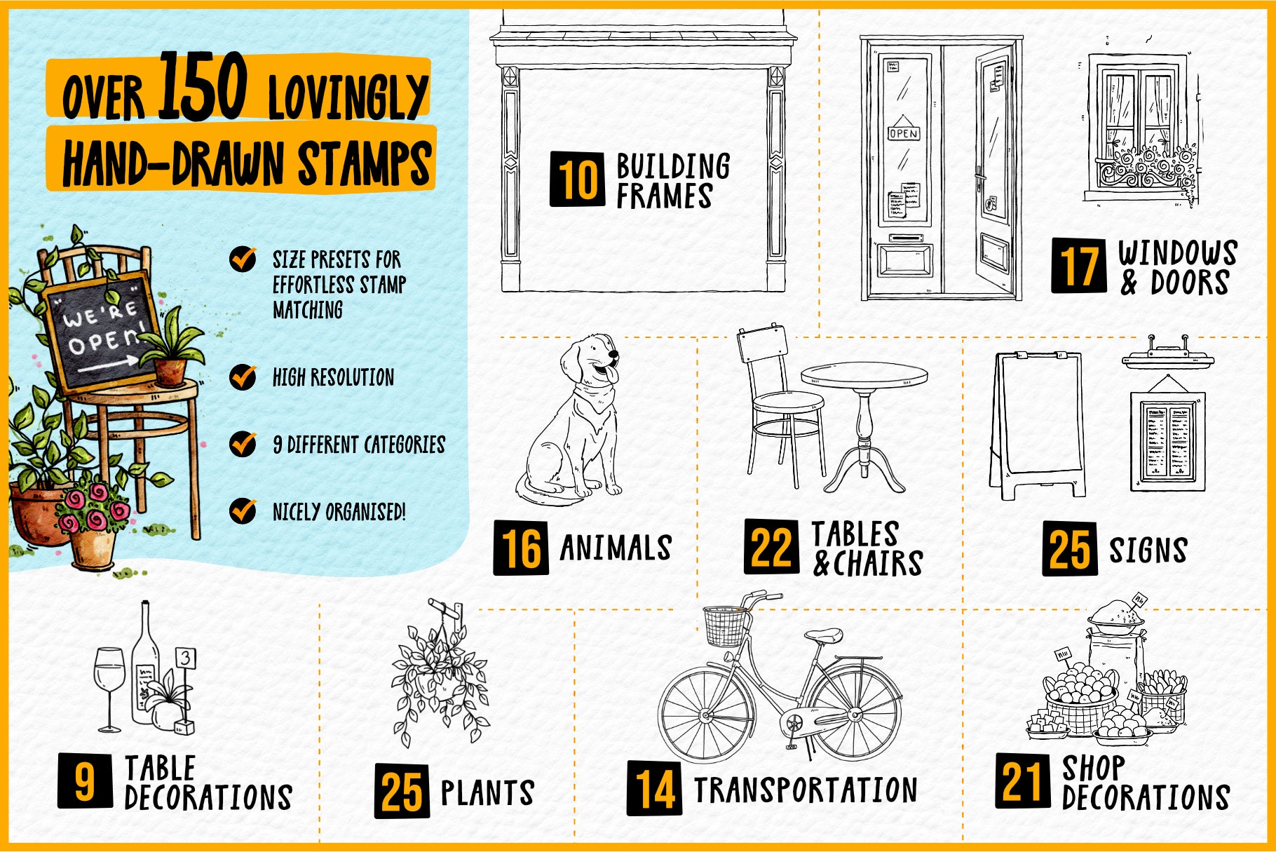 Once again, InkyPaperHouse has created a unique, gorgeous and MASSIVE library of characterful illustrations, ranging from windows and doors to animals to signage, table-top decorations - and even transport! Create complete, high resolution lineart illustrations in a matter of minutes. (Psst - all the stamp brushes have size presets so you can get stamping straight away without even needing to resize anything, unless you really want to!).