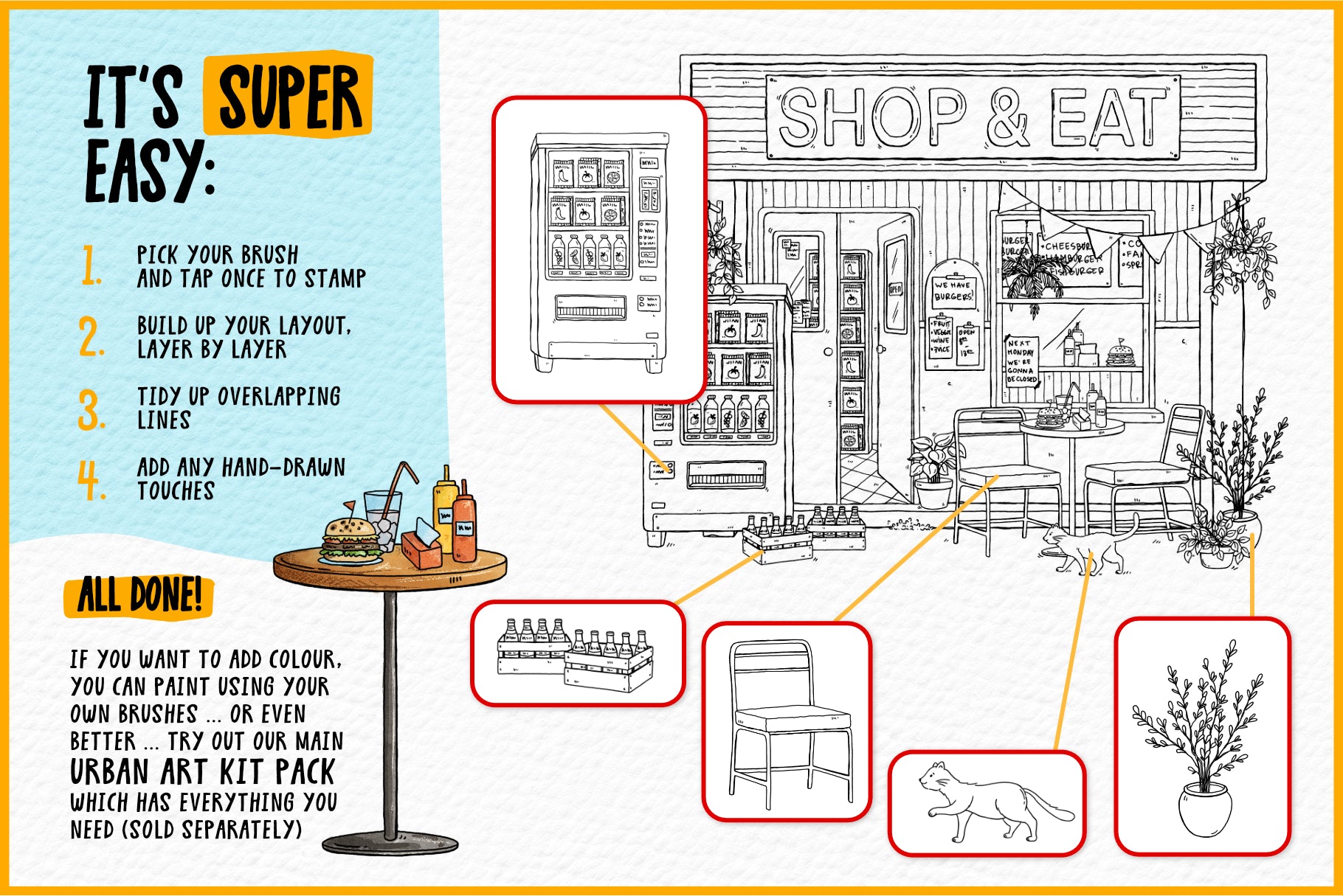This pack can 100% be used as a standalone collection of brush stamps to create complete urban building lineart illustrations at warp speed - but do take a peek at our main Urban Art Kit (sold separately) as it contains everything else you might ever need, including inker brushes (the same ones used for creating all these stamps), watercolour brushes, high resolution canvas textures, colourful overlay images, colouring pages, washi tapes, coffee stains and lots, lots more. Nearly forgot - you also get the complete Stamps MEGAPACK 1 for FREE with this pack - and everything matches up nicely from both sets - woohoo :)