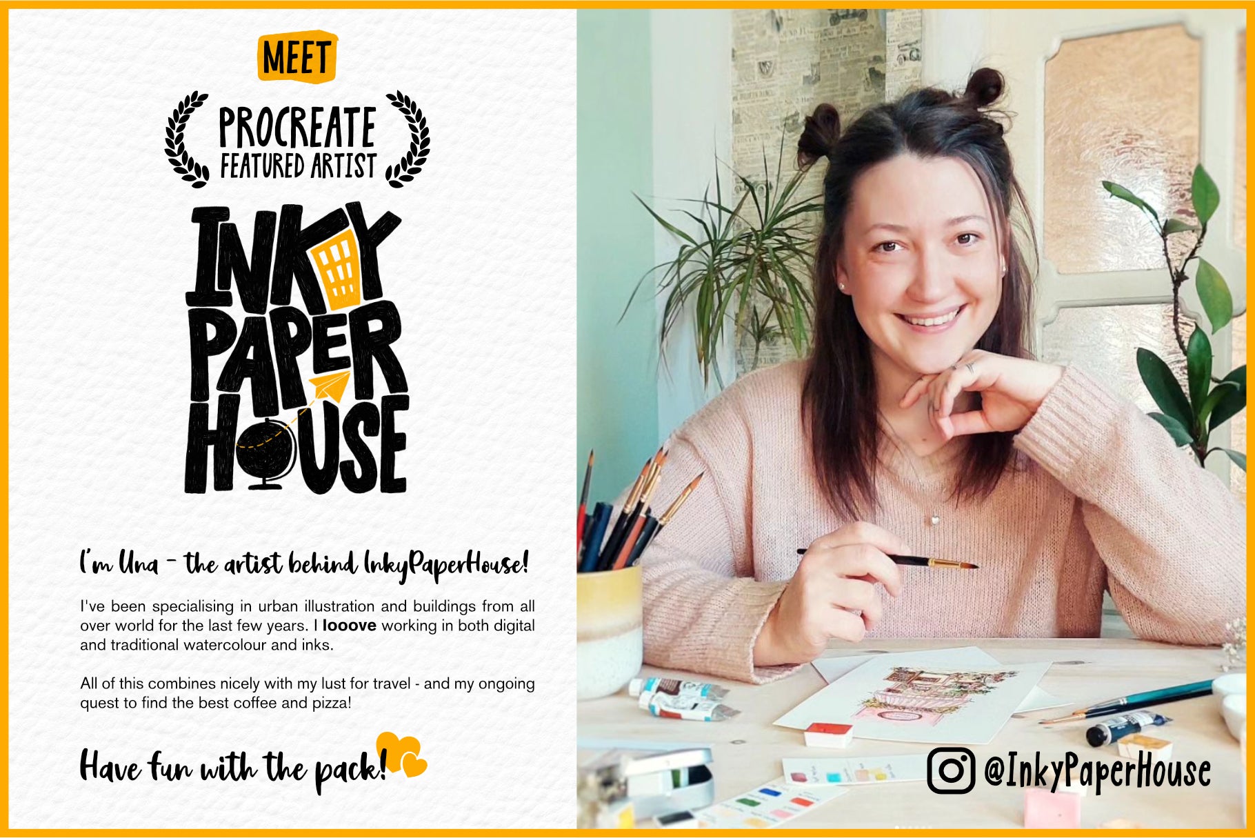 We’ve also included a QuickStart PDF guide to get you up and running, plus there are other bonus goodies such as complete, layered Procreate files (so you can have a look to see how the stamps are all set up) as well as fully finished line art illustrations ready for you to import and paint using your own brushes. You can also check out a full YouTube playlist of the brushes in action and get a breakdown of InkyPaperHouse’s approach to digital illustration.